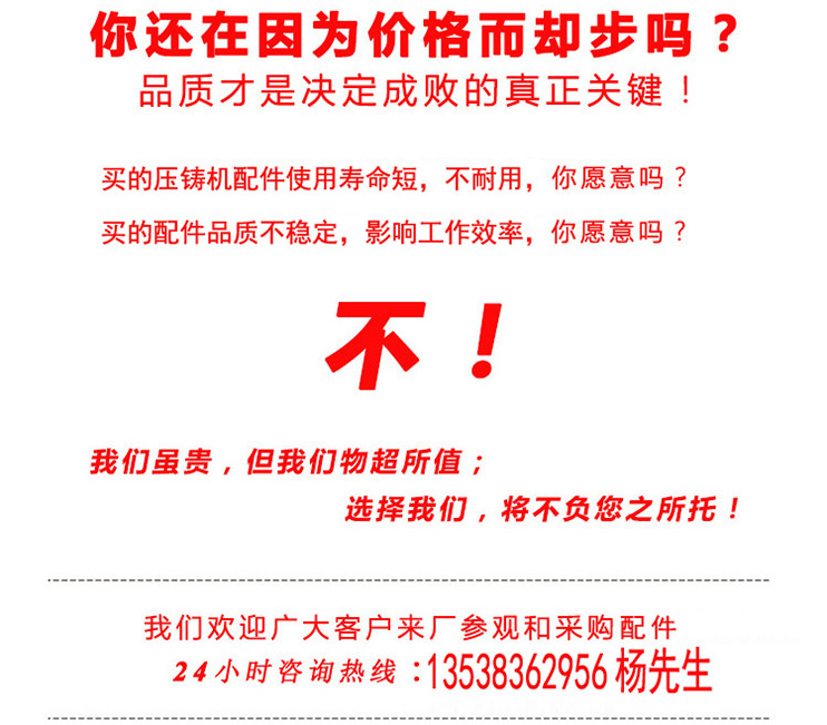 成达凭借在压铸机配件领域专业水平和成熟术的技术,以及在珠江三角洲多元化的信息优势,通过吸取国外先进的加工、热处理、氮化技术,经过多年的技术实践、研发和创新,配件使用寿命等同进口配件使用寿命,我司生产的压铸机配件销往全国各地和远销新加坡、越南、台湾等地区。